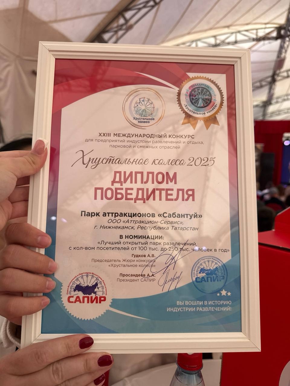 Парк аттракционов «Сабантуй» стал победителем Международного конкурса «Хрустальное колесо» в номинации «Лучший открытый парк развлечений с количеством посетителей от 100 до 250 тысяч человек в год».