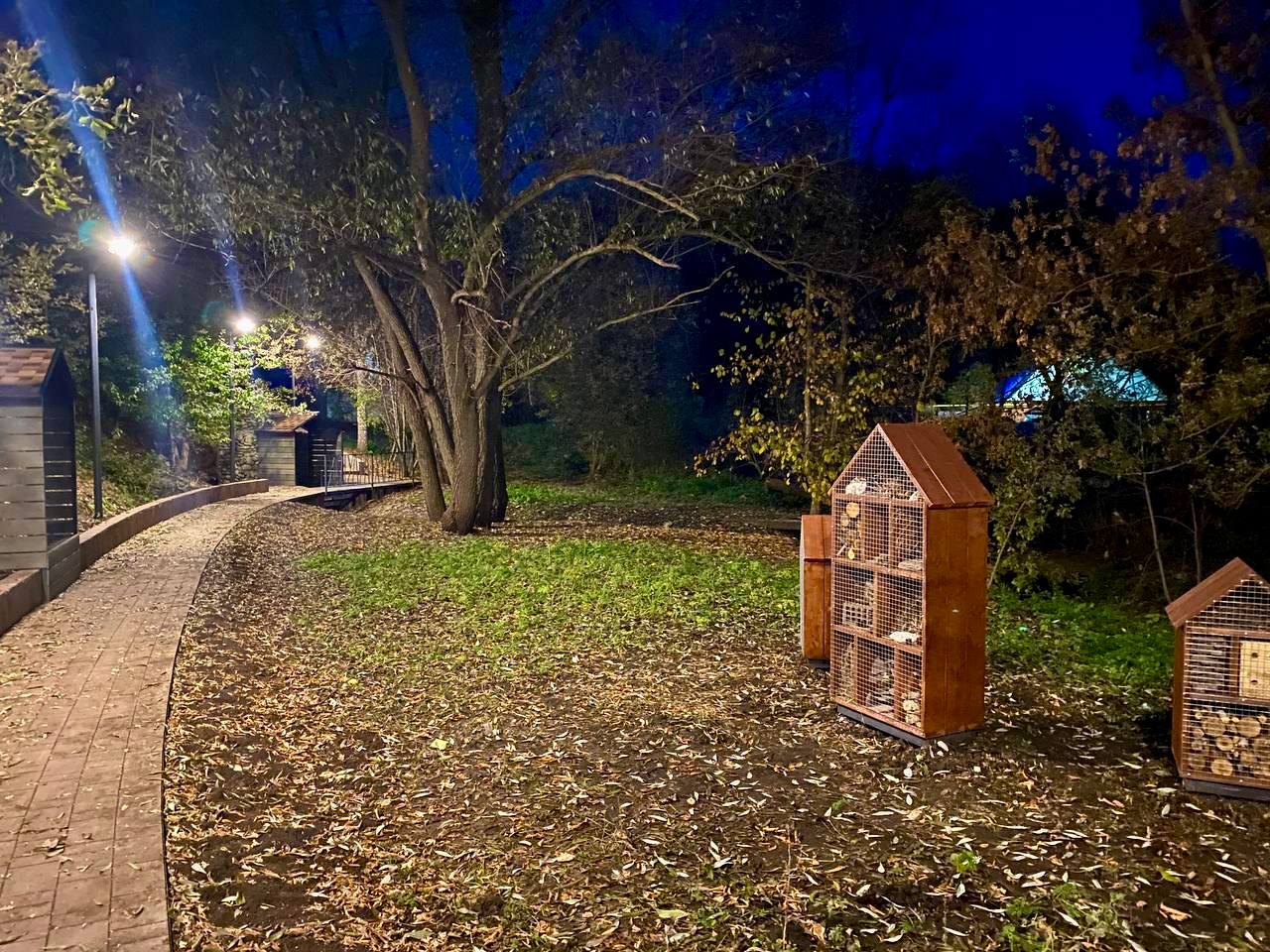 На территории появились первые «отели» для полезных насекомых, а участники детской архитектурной школы создали и установили ещё несколько таких домиков.