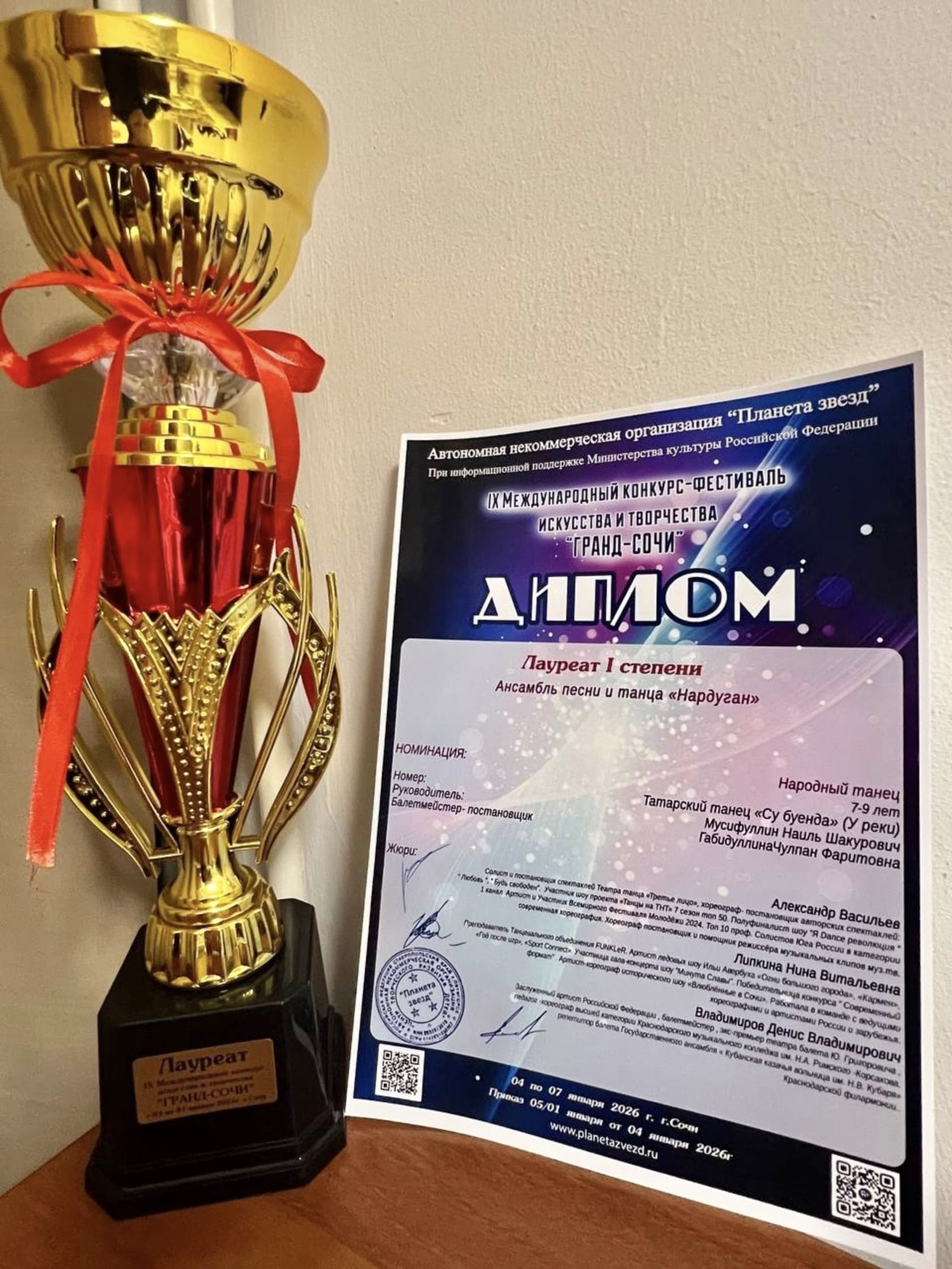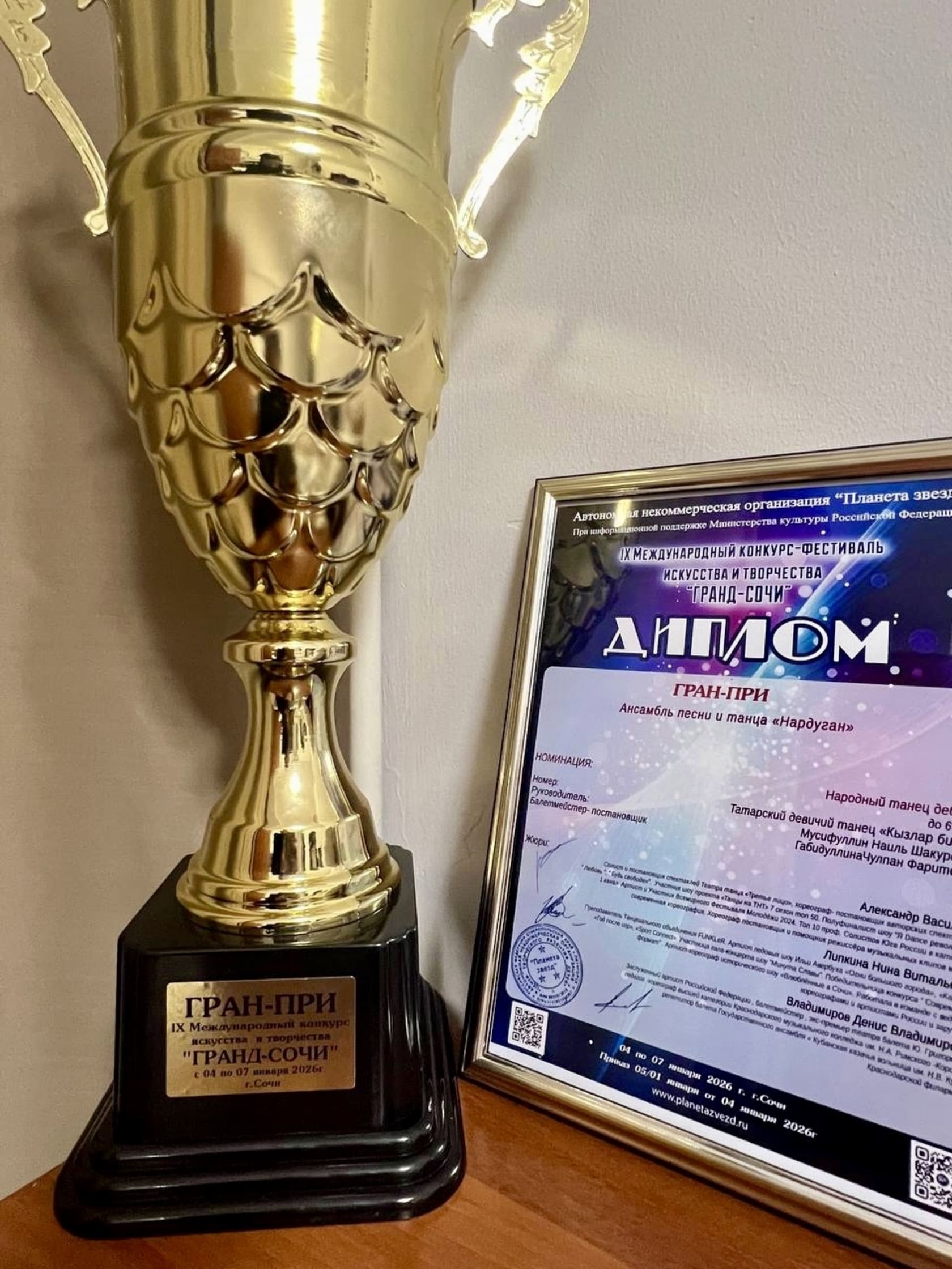5 января в Сочи прошёл IX Международный конкурс-фестиваль искусства и творчества «Гранд-Сочи». В нём приняла участие подготовительная группа ансамбля песни и танца «Нардуган» из Нижнекамска.
